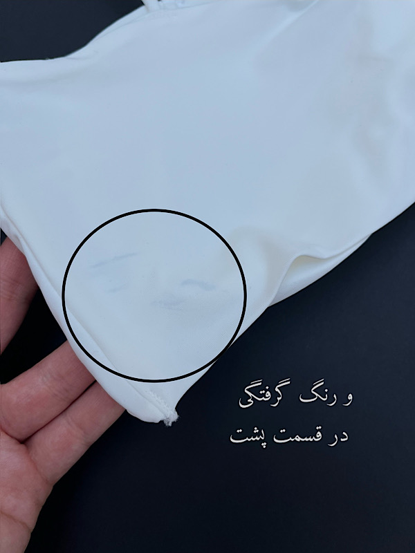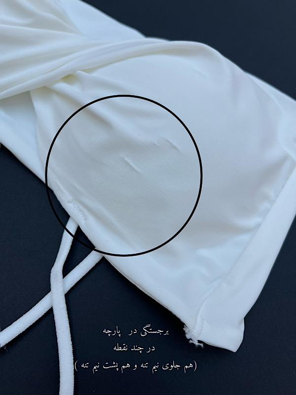 رنگ سفید : برجستگی هایی در پارچه در بعضی نقاط نیم تنه هست و در قسمت پشت یک قسمت رنگ گرفتگی دارد